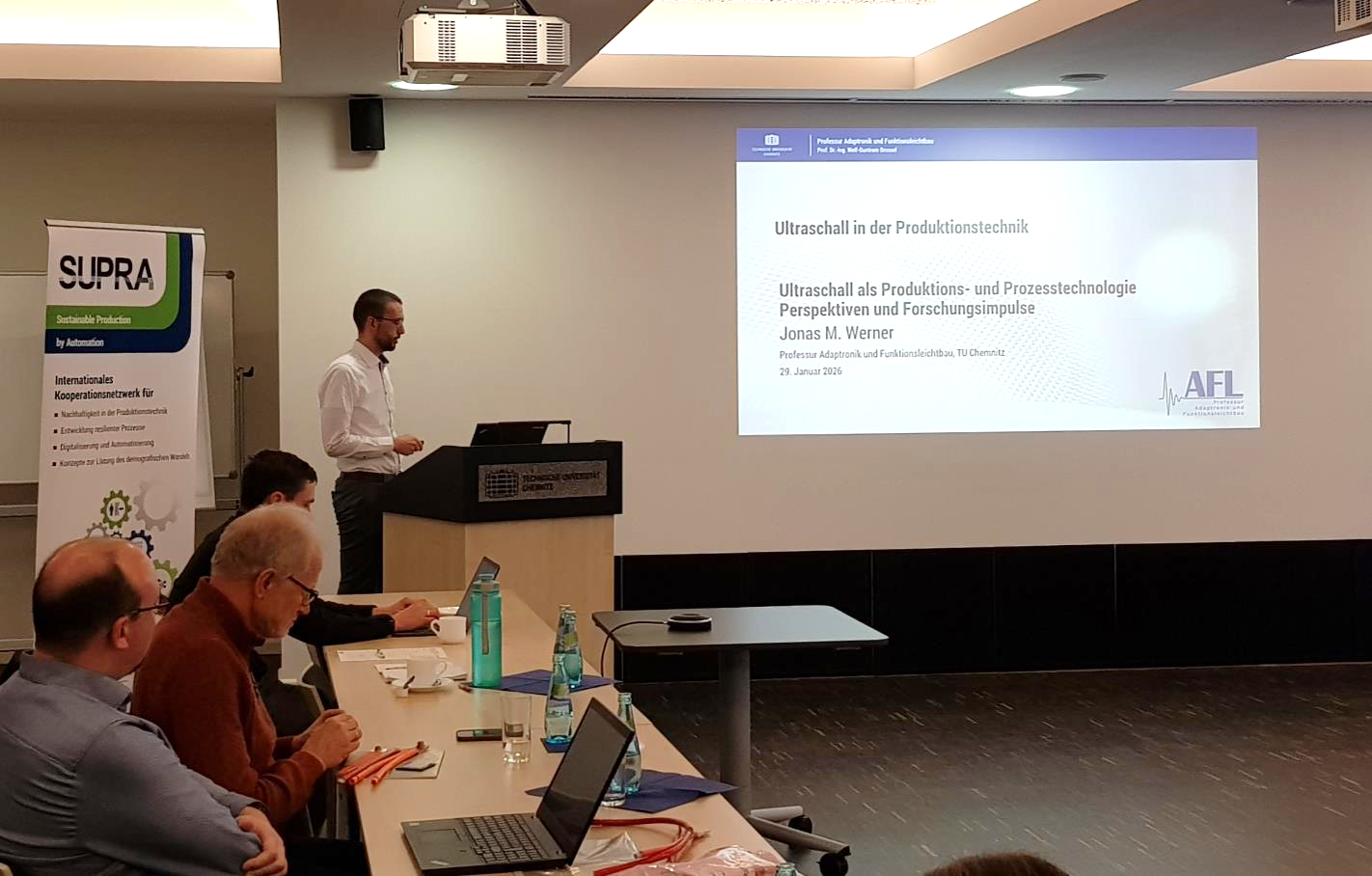 Im Anschluss an das Netzwerktreffen fand der Workshop „Ultraschall in der Produktionstechnik“ statt, der sich durch seine breit gefächerten und praxisorientierten Inhalte auszeichnete. Jonas M. Werner (Professur für Adaptronik und Funktionaler Leichtbau) gab den Teilnehmern mit seinem Vortrag „Ultraschall: zwischen Systemverständnis und Anwendung“ eine Einführung in das Thema. Es folgten Fachvorträge von Frank Gärber-Lange (DeSonic GmbH) zum Thema „Industrielle Teilereinigung: Verfahren, Anlagen und Praxisbeispiele“, Dr.-Ing. Andreas Gester (Professur für Verbundwerkstoffe und Materialkomposite) mit einem Vortrag zum Thema „Von der Kabelkonfektion bis zu Strukturbauteilen – ultraschallunterstützte Fügeprozesse“ und Jonas M. Werner (Professur für Adaptronik und Funktionaler Leichtbau) mit Ausführungen zum Thema „Ultraschall als Produktions- und Verfahrenstechnik – Perspektiven und Forschungsimpulse“. Neben den Vorträgen bot der Workshop reichlich Zeit für Networking. Wir danken allen Referenten und Teilnehmern für die vielfältigen Ideen, die offene und anregende Atmosphäre, die zu zahlreichen fachlichen Diskussionen und einem regen Austausch zwischen den Teilnehmern führte und den interdisziplinären Charakter der Veranstaltung unterstrich.